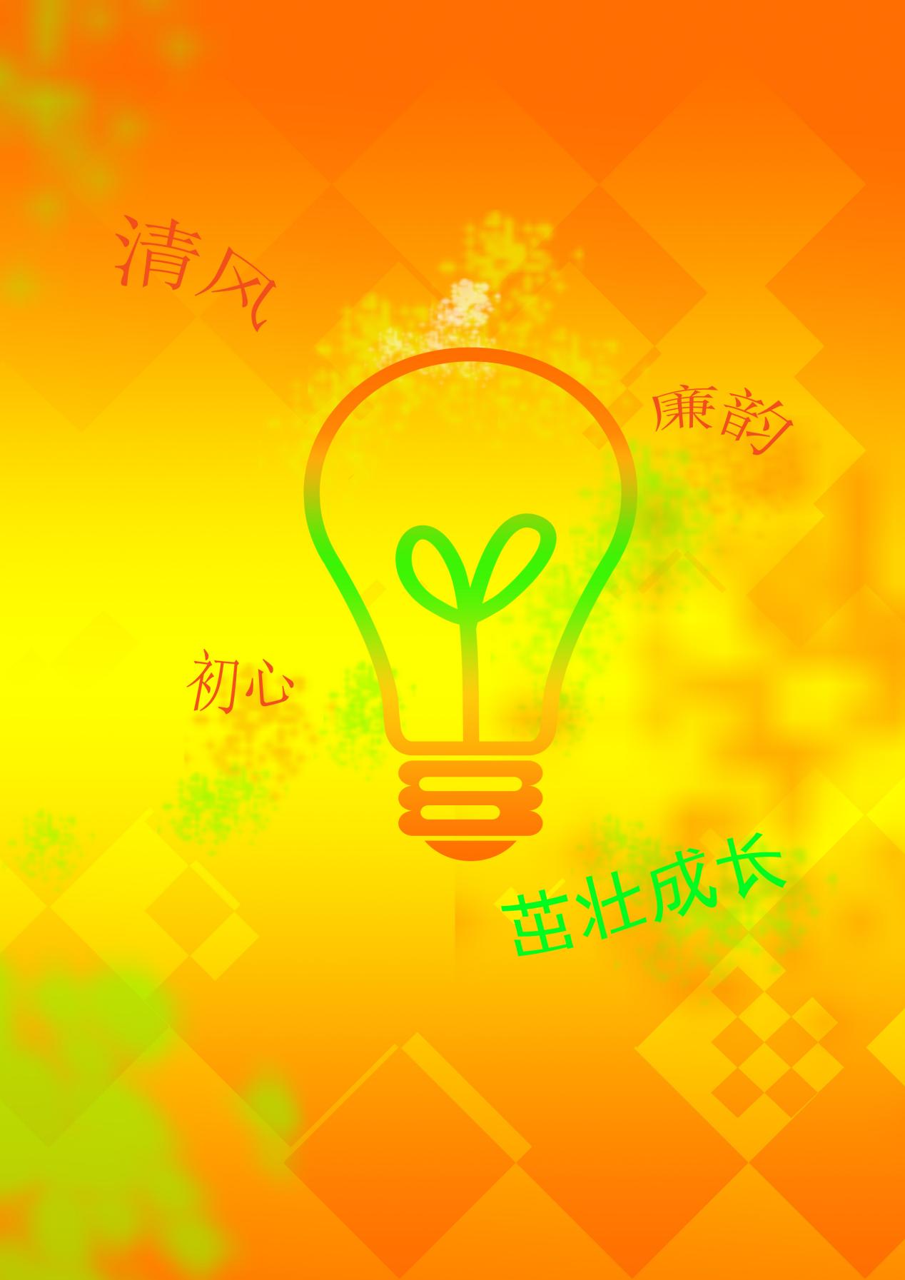海报主要构成为文字和图案。以“灯泡”为主题元素,代表光明与希望,内部灯芯变形为“绿芽”,代表莘莘学子与澄澈初心。灯泡周围搭配“清风”、“廉韵”等文字与主题相扣,突出“清廉校园”的中心。背景设计层次叠加也暗含着校园建设需要各方共同努力,层层递进。