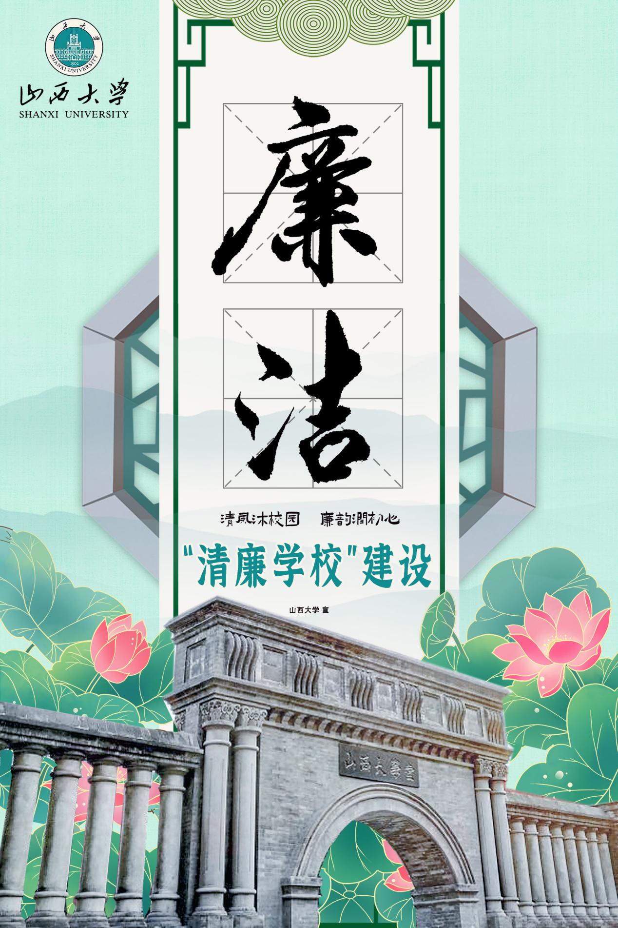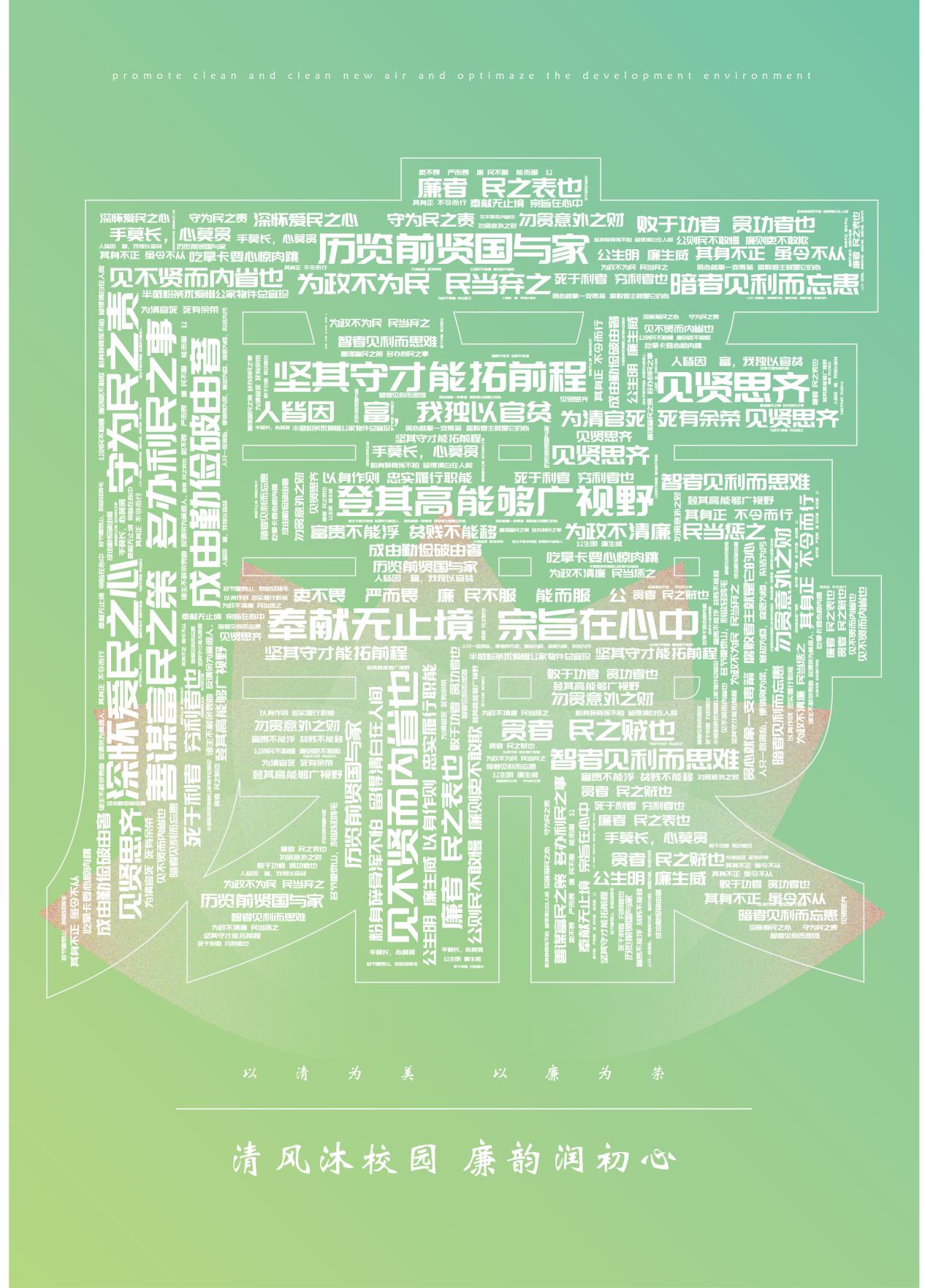 视觉主体以廉字为中心,收集了数条自古以来关于清廉的诗句组成一个大大的廉字,底部有象征清廉的莲花图案而组成,不仅点清海报主题,也蕴含着中国自古以来的清廉文化,内容简洁清晰,文字组成的图片文字整体使用白色凸显主题,背景采用清新自然的蓝绿色衬托文字和荷花图案,建设清廉校园是师生共同参与的工作机制,希望通过设计作品传递出赢博在线手机版(大中国区),清廉校园文化。