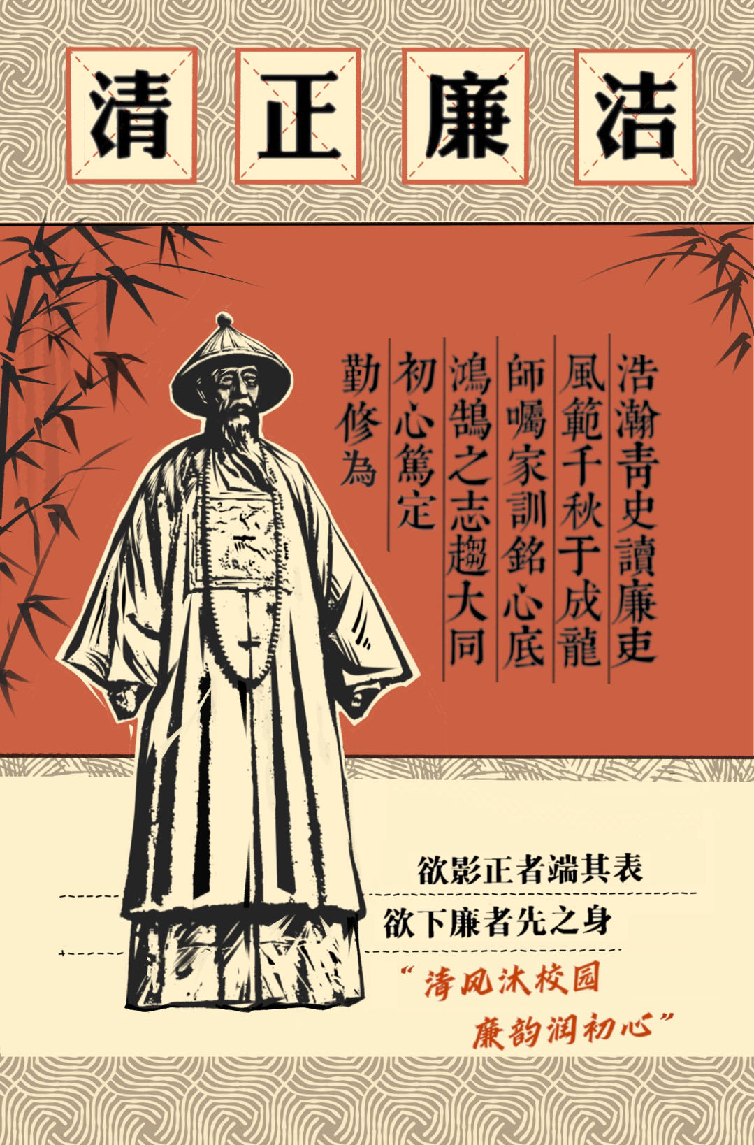 画面中心是清初名臣于成龙的全身像,临近全身画的文字以书法形式表达了于成龙的廉洁。于成龙的全身像以黑白木刻贴合画面主体,更容易衬托人物廉吏天下第一的形象,以竹子修饰画面边缘,呼应画面右下的“欲影正者端其表”,表达了做人应该清正廉洁。底色为蜜色,以茶色纹理和大红色块做画面拼接,最上方的“清正廉洁”突出主旨。右下方“清风沐校园,廉韵润初心”深化活动主题。