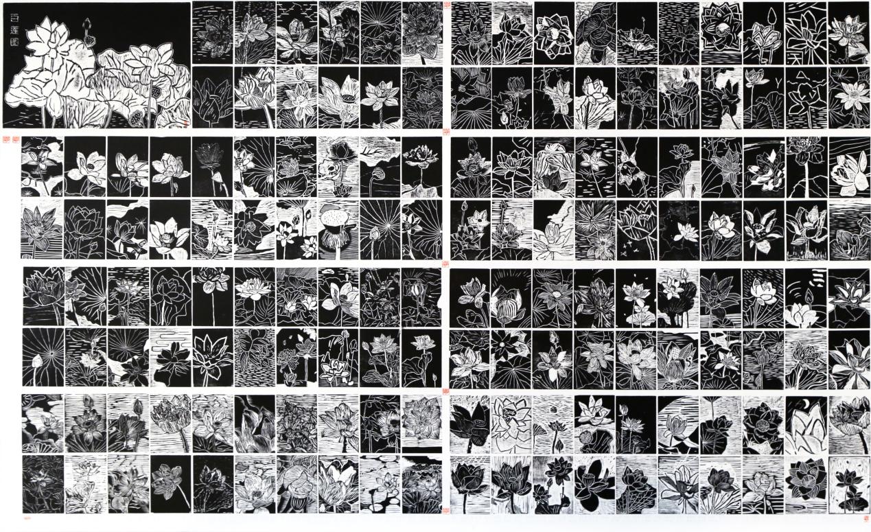 木刻版画长卷《百莲图》系列作品与清廉文化主题创作高度贴合,在方寸木板中刻画生动的莲花形态,以莲为范,以莲自勉,追求真实情感的表达,邀请山大附中百余名师生以零基础参与到制作当中,共同完成以莲话“廉”,赓续清廉文化血脉,促使廉洁文化深入校园。