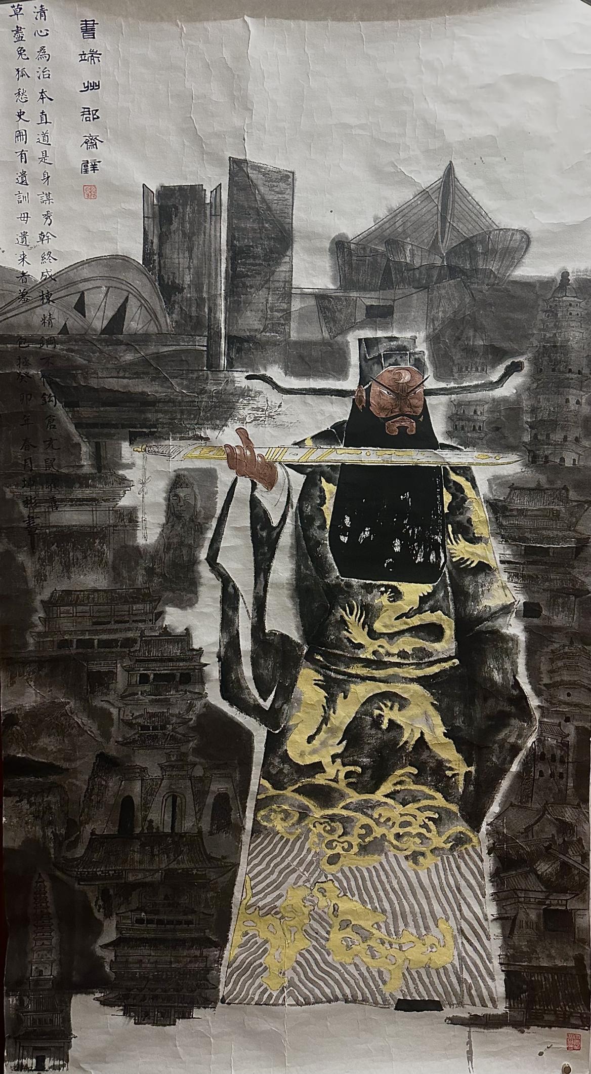 作品主体人物为包拯,背景为山西代表性建筑,题字为包拯《书端州郡斋壁》。包拯虽然不是山西人,但他的廉洁公正影响全国人民,在如当今如此盛世之下,我们依然需要一颗廉洁之心。