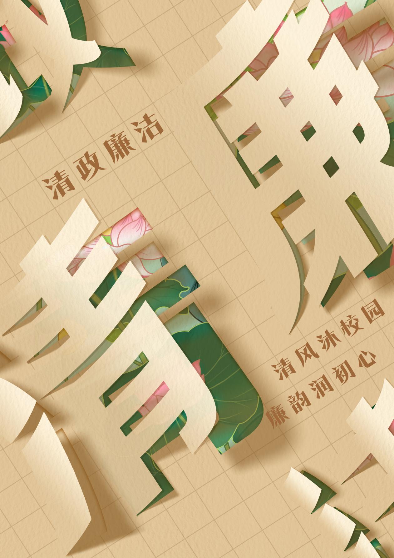 该作品用传统文化剪纸的形式,展现清政廉洁。在格纹纸上剪下清政廉洁的字样,翻开后,底面是莲花荷叶,与之相呼应,随清风吹拂,纸片沙沙作响,荷花清香萦绕鼻尖,让清廉始终留存每个人的心底,让使用格纹纸认真学习的学子们始终不忘初心,在踏上社会之后也能始终保持一颗真心,希望仍在校园的我们也能像莲花出淤泥而不染一样,始终筑牢自己保持廉洁的坚定意志。