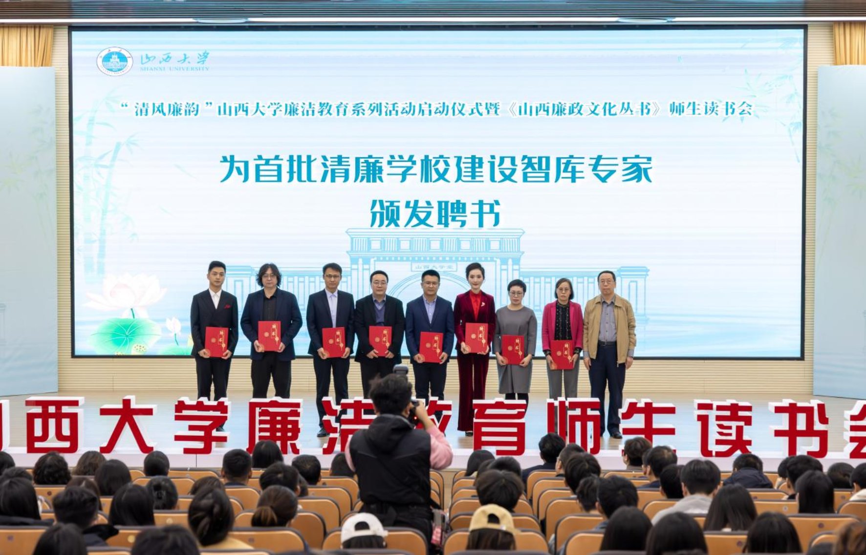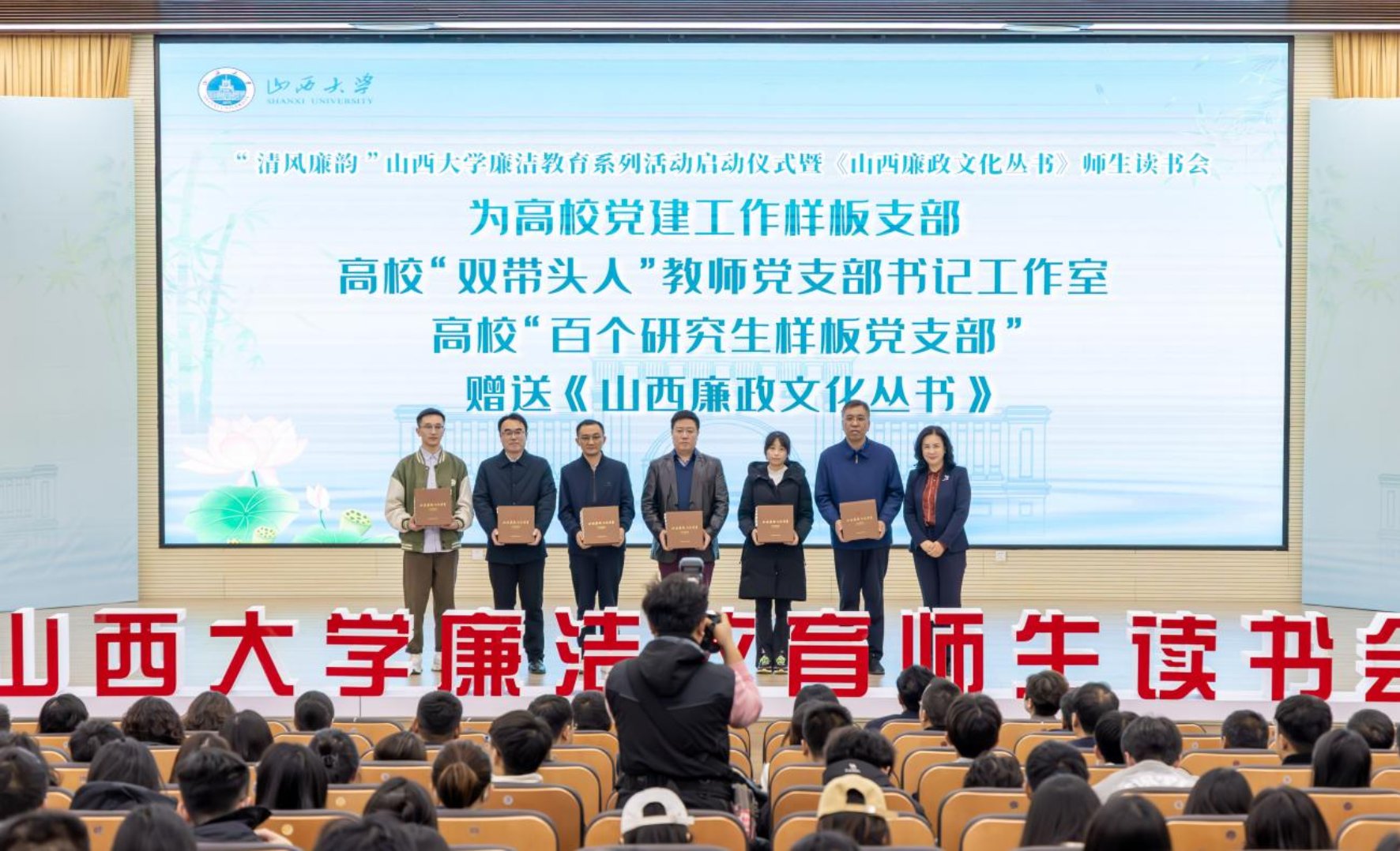 师生读书会现场先后为我校全国高校党建工作样板支部、高校“双带头人”教师党支部书记工作室、高校“百个研究生样板党支部”赠送了《山西廉政文化丛书》,为乔新华等首批清廉学校建设智库专家颁发聘书。