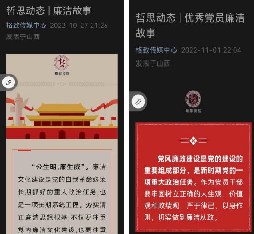 哲学社会学学院官方微信公众号“格致传媒中心”推送优秀党员系列廉洁故事