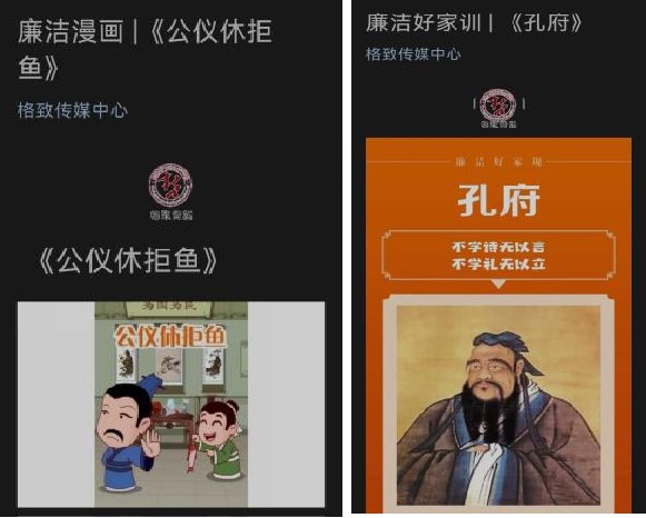 哲学社会学学院官方微信公众号“格致传媒中心”转载“公仪休拒鱼”等系列廉洁和“孔府”等廉洁好家训