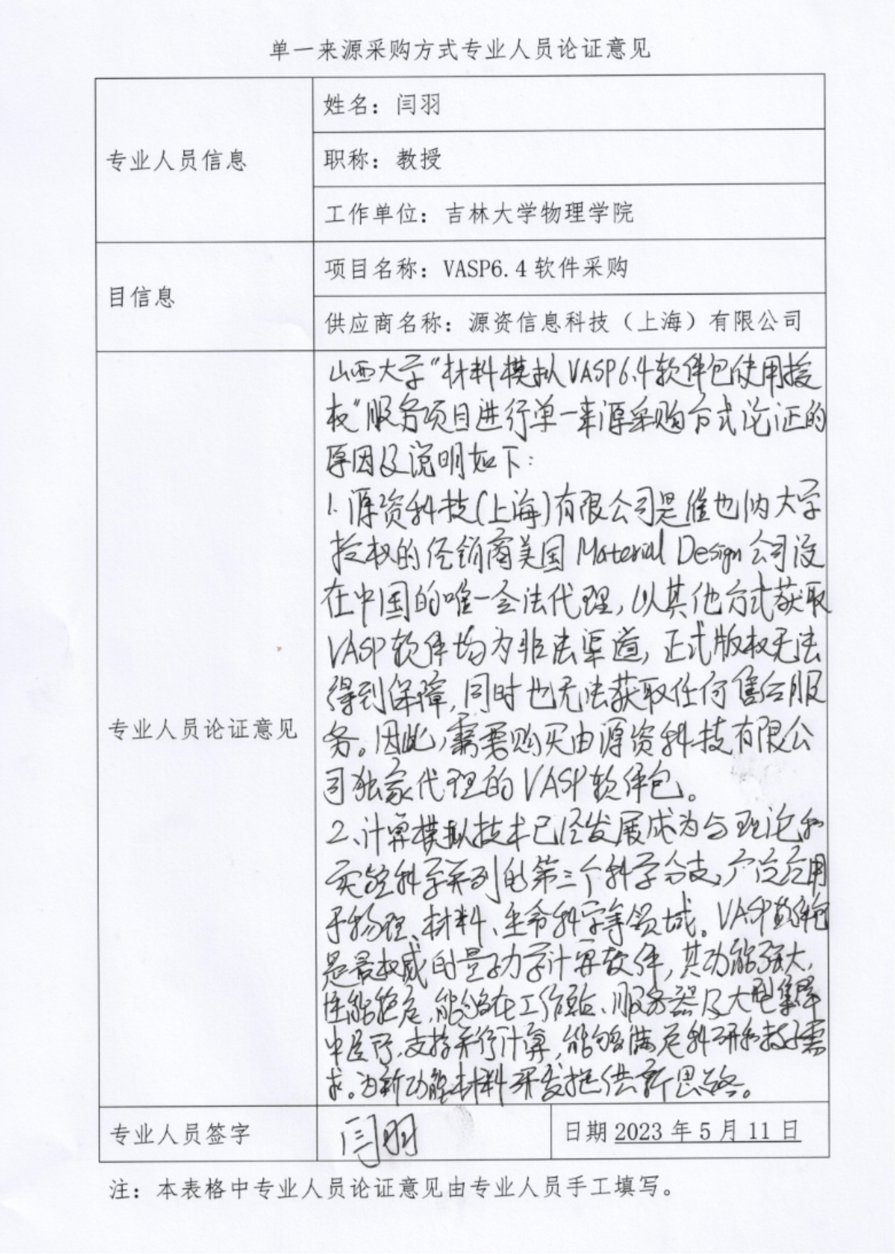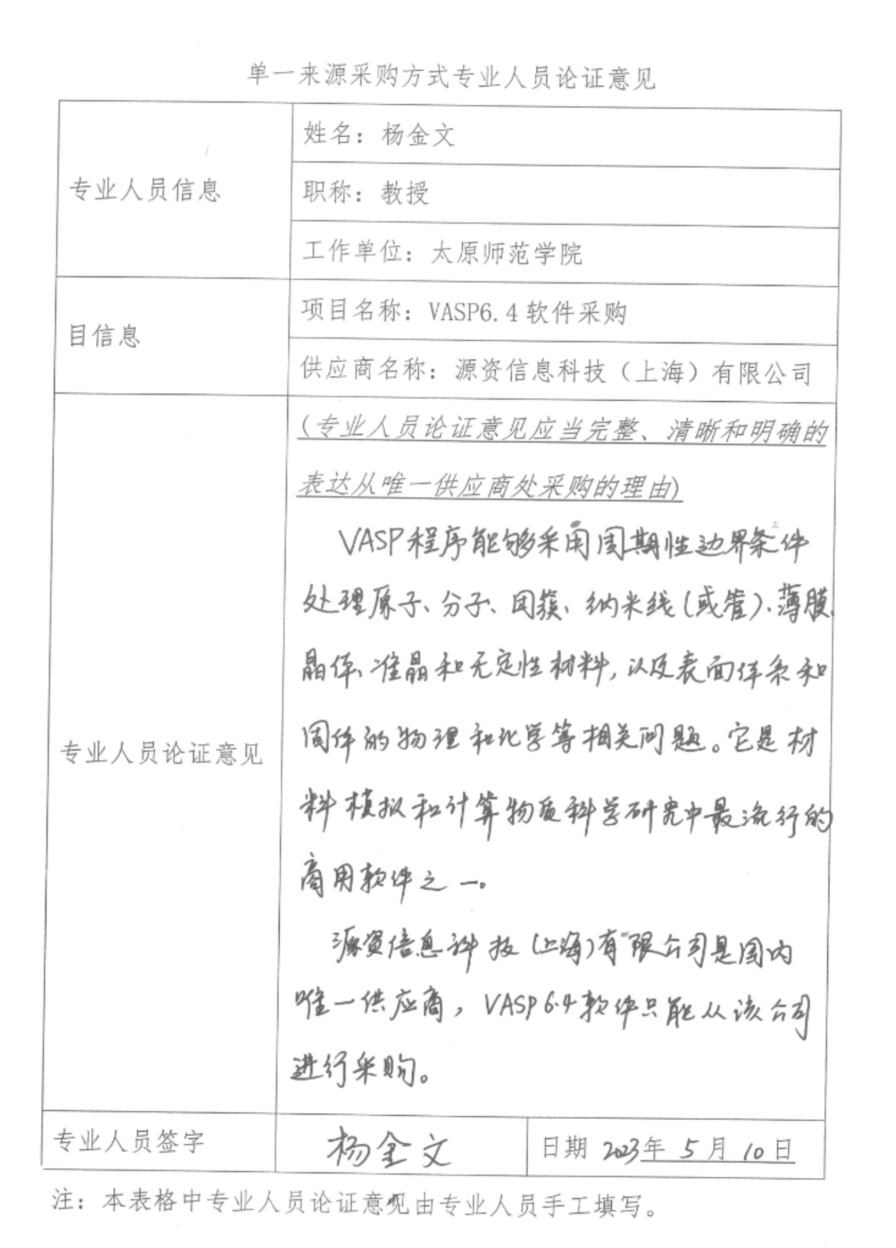 目前,源资信息科技(上海)有限公司为VASP软件在中国地区的软件及售后服务提供商(中国地区授权一家,可提供正规授权函)。因此,申请此项目以单一来源方式采购。