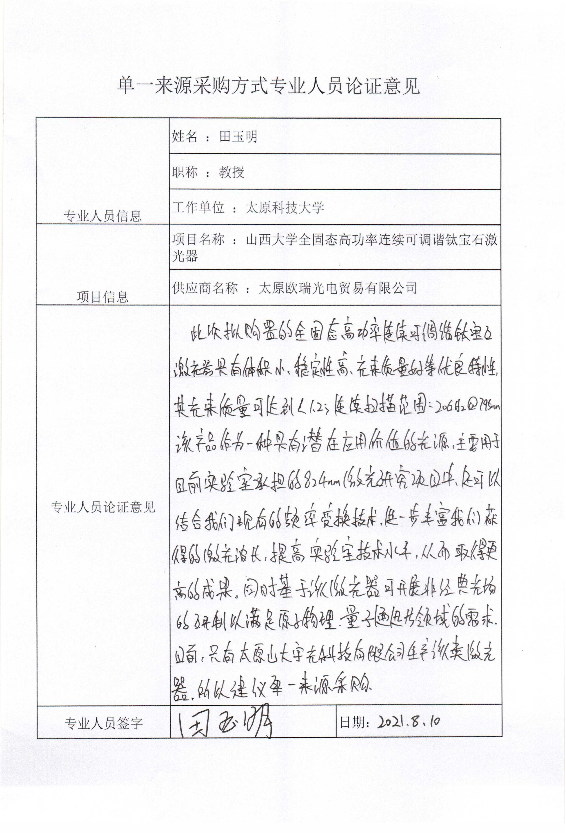 采用单一来源采购方式的原因及说明:目前满足上述技术参数的全固态高功率连续可调谐钛宝石激光器,只有太原山大宇光科技有限公司可以生产,太原欧瑞光电贸易有限公司是太原山大宇光科技有限公司在中国此项目的唯一代理商,因此,申请以单一来源方式采购。