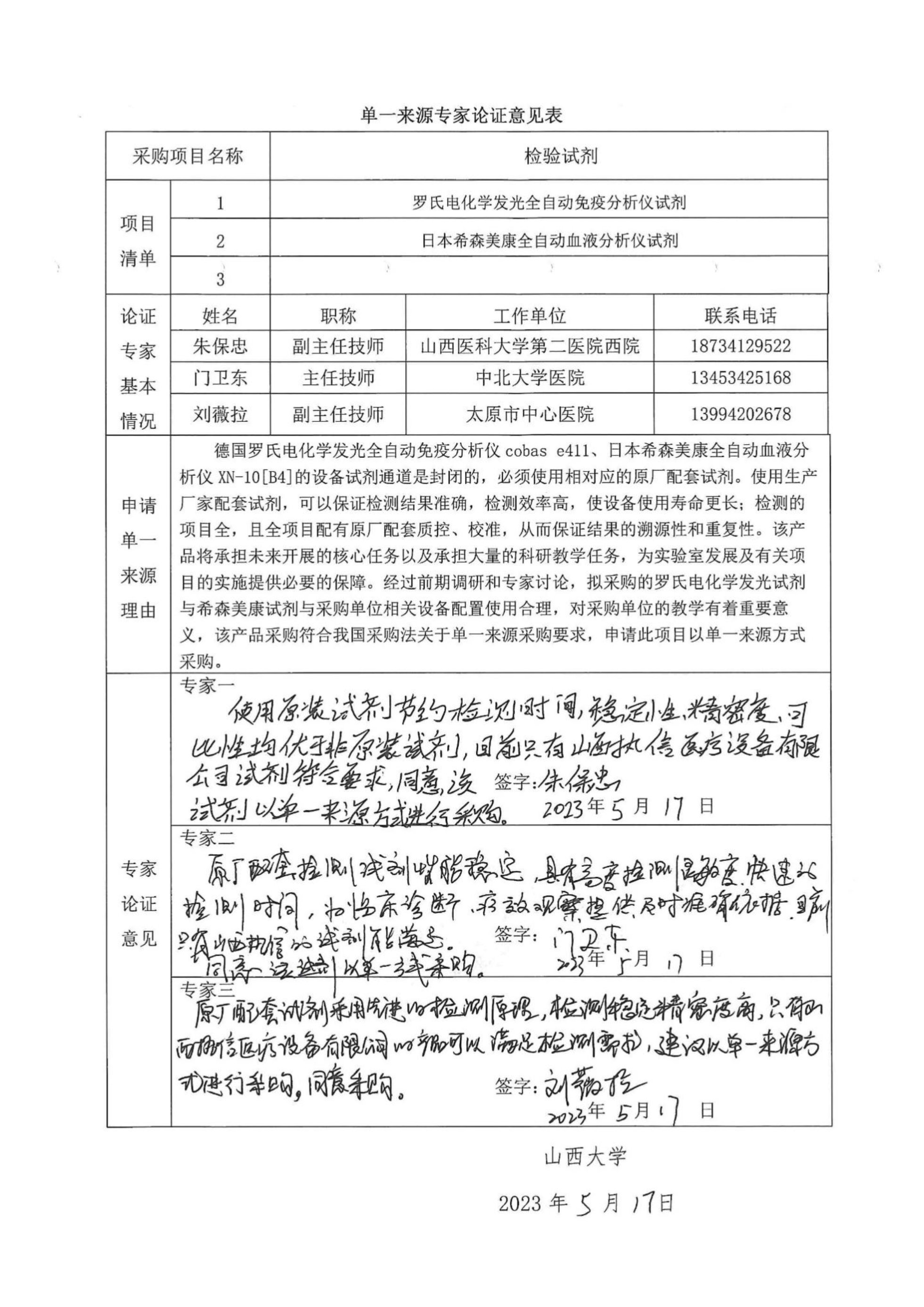 采用单一来源采购方式的原因及说明:此设备使用生产厂家配套试剂,可保证检测结果准确,检测效率高,使设备使用寿命更长,检测的项目全,且全项目配有原厂配套质控、校准,从而保证结果的溯源性和重复性。该产品将承担未来开展的核心任务以及承担大量的科研教学任务,为实验室发展及有关项目的实施提供必要的保障。经过前期调研和专家讨论,拟采购的罗氏电化学发光试剂与希森美康试剂与采购单位相关设备配置使用合理,对采购单位的教学有着重要意义,该产品采购符合我国采购法关于单一来源采购要求,申请此项目以单一来源方式采购。